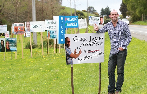 Nelson jeweller Glen James was told to pull down his billboard along Waimea Rd last week. He put up the billboard next to all the billboards advertising the candidates for Nelson City Council. Photo: Andrew Board.