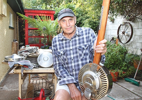 John makes his slide guitars out of old hub caps, cigar boxes and even old ceiling fans, most of which are either given to John from mates or he sources from the recycle centre. He adds wood for the neck and adds bits of “bling” from old food processors, cutlery, hinges and keys, before adding the strings and tuning them up.
