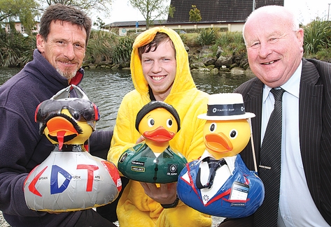 DRESSED UP DUCKS: As part of St John’s annual duck race down the Maitai River this Sunday, some local businesses have dressed up their sponsored ducks including, from left, Francis Lagrutta from Nelson Auto Glass, Rhys Griffith from St John and Keith Adams from Forsyth Barr. Photo: Andrew Board.