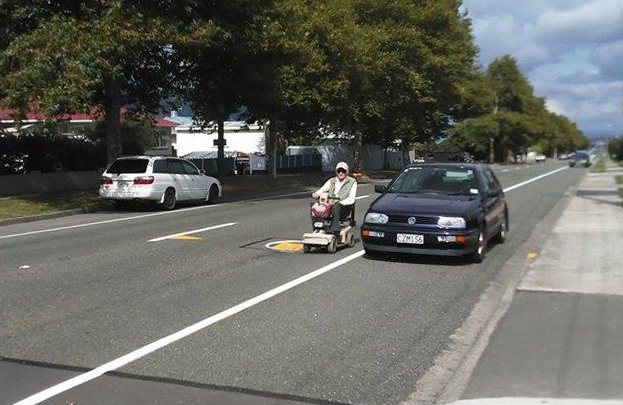 The photo was sent to Nelson Live this afternoon and shows a man driving his mobility scooter on the road, which is against the law. The photographer said there were two others travelling on their scooters in the same way at the time.