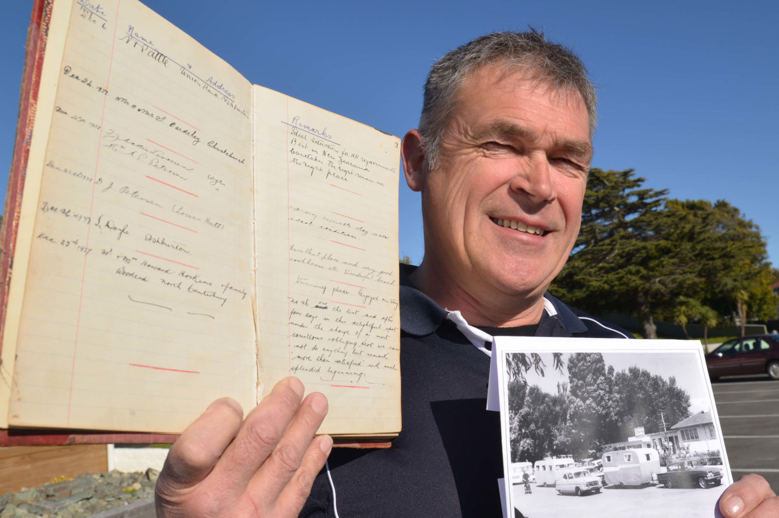 Tahuna Beach Holiday Park general manager Marcel Fekkes with the 1937 visitor book, and a photo from the 1960s taken outside the same reception building that still stands today. Photo: Kate Russell.