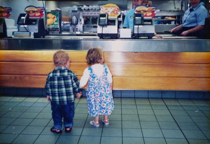 A family friend captured the sweet moment that cousins Josh and Louisa Denton held hands in front of the Nelson McDonald’s counter in October 1999, and almost seventeen years later the pair returned to recreate the photo.