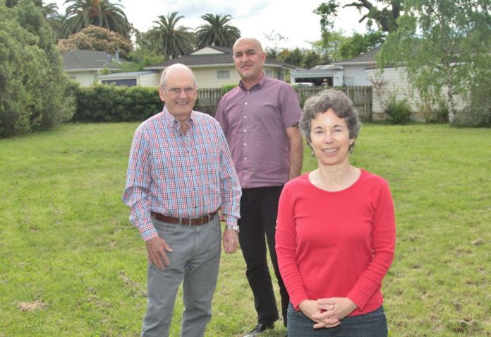 Nelson Tasman Housing Trust’s Doug McLearie, left, with chairman Dave Johnston, centre, and director Carrie Mozena on the site of the new development. Photo: Jessie Johnston.