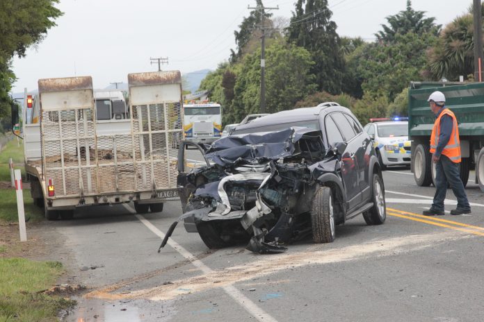 A crash on State Highway 6 this morning involving two cars and a truck resulted in one driver being taken to hospital. Photo: Jessie Johnston.