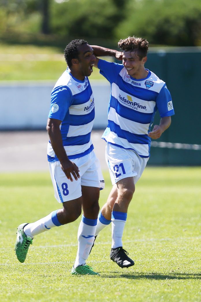 NELSON, NEW ZEALAND - MARCH 18: Paul Ifill and Matt Tod-Smith celebrate the first goal. Tasman United v Southern United at Trafalgar Park on March 18 2017 in Nelson, New Zealand. (Photo by: Evan Barnes Shuttersport Limited)