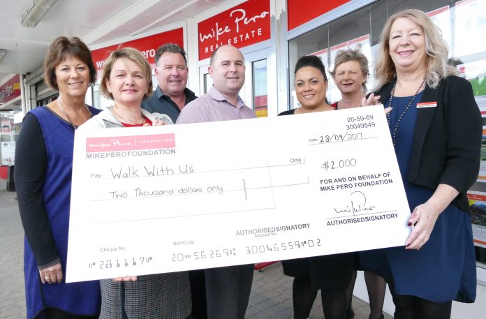 Walk With Us trustees Janet Taylor and Jenny Bates, left, with Mike Pero's, from left, Craig Hamilton, Mitchell Wilson, Katarina Campbell, Michelle Westrupp and Helen Ruston at Mike Pero's Richmond office on Monday. Photo: Simon Bloomberg.