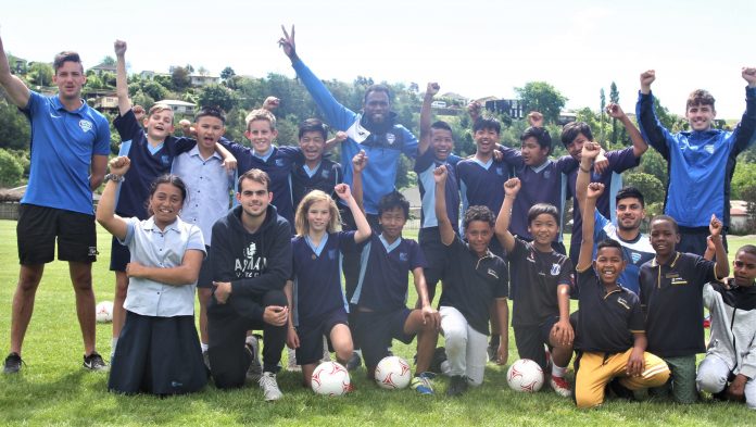 Tasman United players with the latest crop of young Nelson footballers. Photo: Jonty Dine.