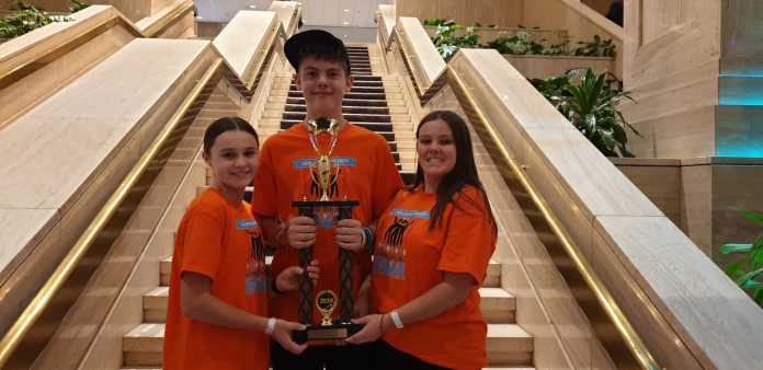 Nelson teens Tiana Simpson, 14, Matthew Edgar, 15, and Sophie McCarlie, 17, with their musical theatre award in Atlanta, Georgia. Photo: Supplied.