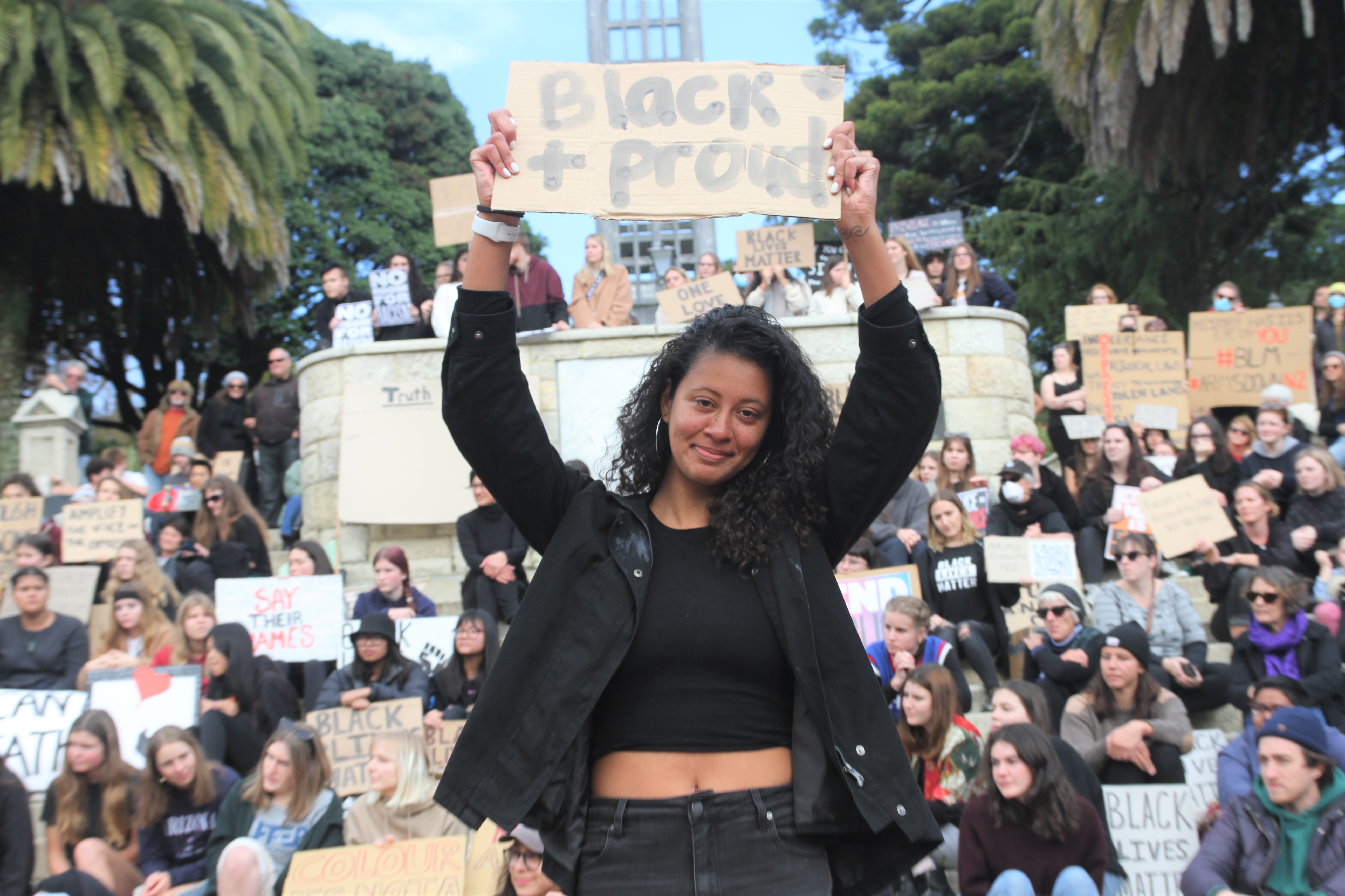 In Nelson, protesters sat in solidarity with placards reading ‘Black Lives Matter” before marching through the city and chanting “no justice, no peace”.