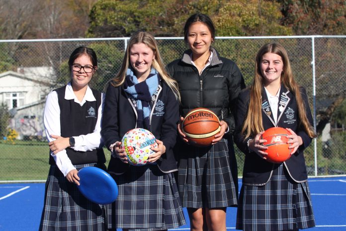 Nelson College for Girls students Lizzie Neale, Scarlet Powell, Kimberley Curry and Jensy Moyle enjoying the school’s new multipurpose astroturf. Photo: Jonty Dine.