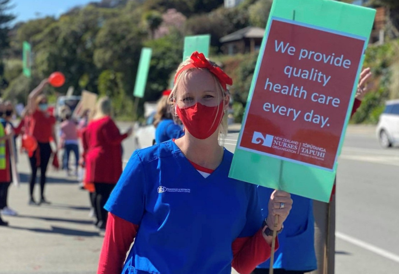 Gathering at key locations to picket for equal pay in line with District Health Board nurses, frustrated staff say they are being paid 10.6 per cent less.